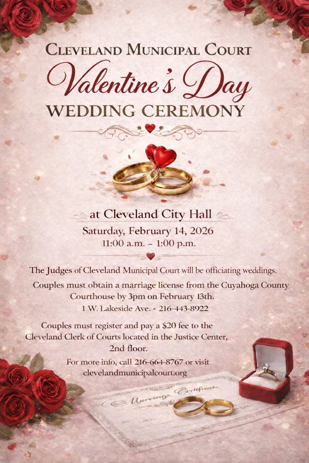 The Cleveland Municipal Court will be officiating weddings on Valentine’s Day at Cleveland City Hall starting at 11:00 am on Saturday February 14, 2026. Any couple interested must arrange for their marriage license
